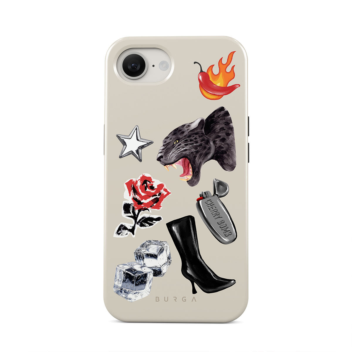 This design features: black panther, red rose, burning bell pepper, silver lighter, black knee-high boots, ice cubes, silver star