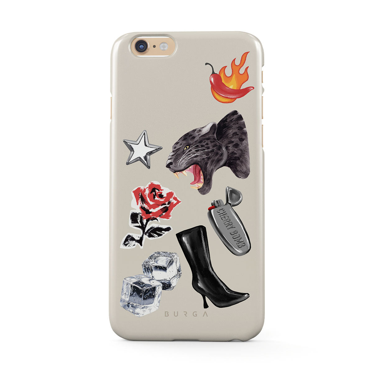 This design features: black panther, red rose, burning bell pepper, silver lighter, black knee-high boots, ice cubes, silver star