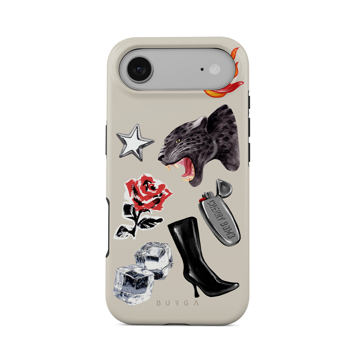 This design features: black panther, red rose, burning bell pepper, silver lighter, black knee-high boots, ice cubes, silver star