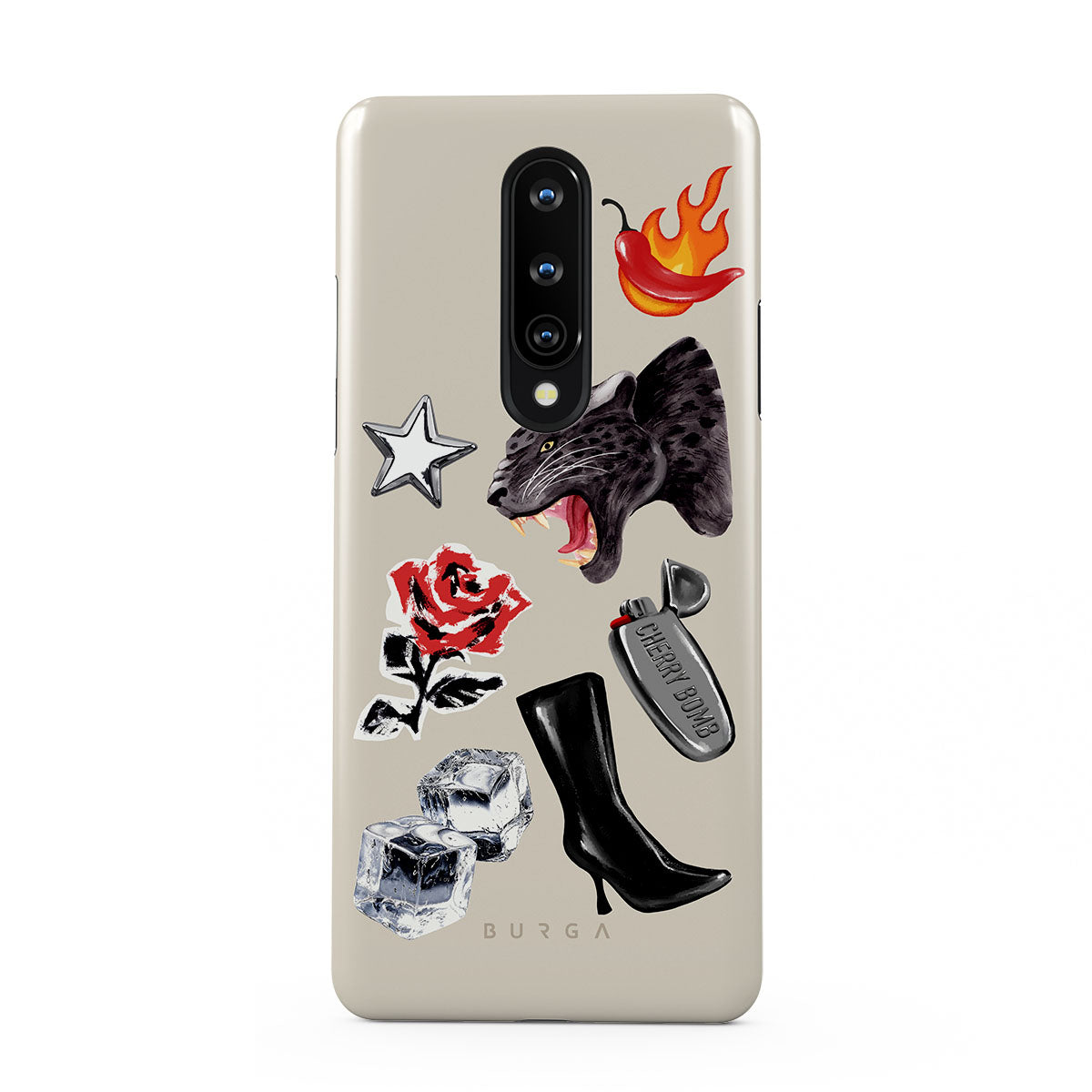 This design features: black panther, red rose, burning bell pepper, silver lighter, black knee-high boots, ice cubes, silver star