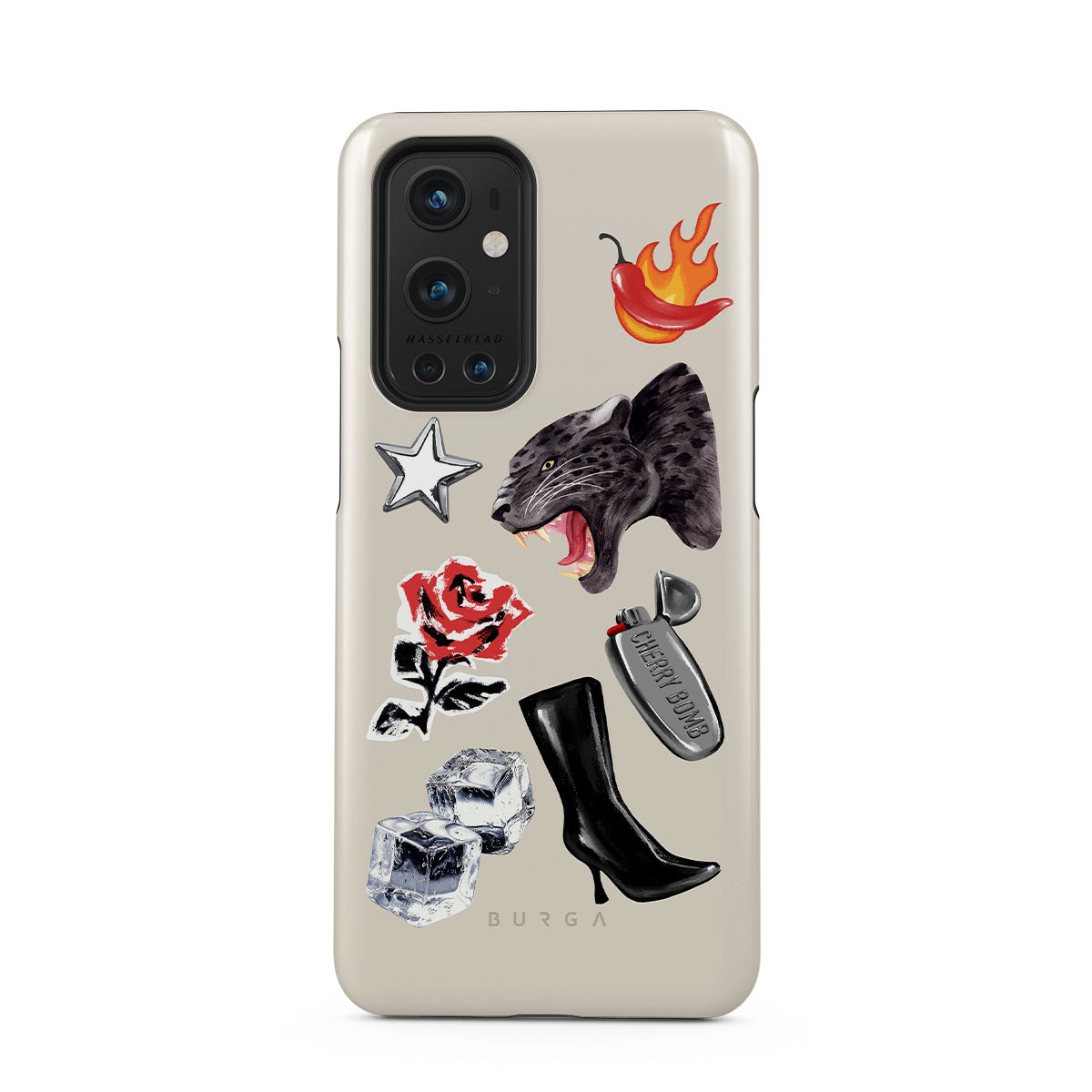 This design features: black panther, red rose, burning bell pepper, silver lighter, black knee-high boots, ice cubes, silver star