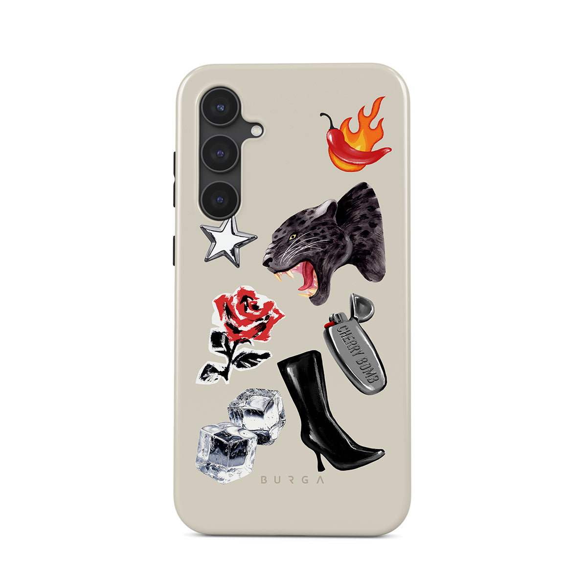 This design features: black panther, red rose, burning bell pepper, silver lighter, black knee-high boots, ice cubes, silver star