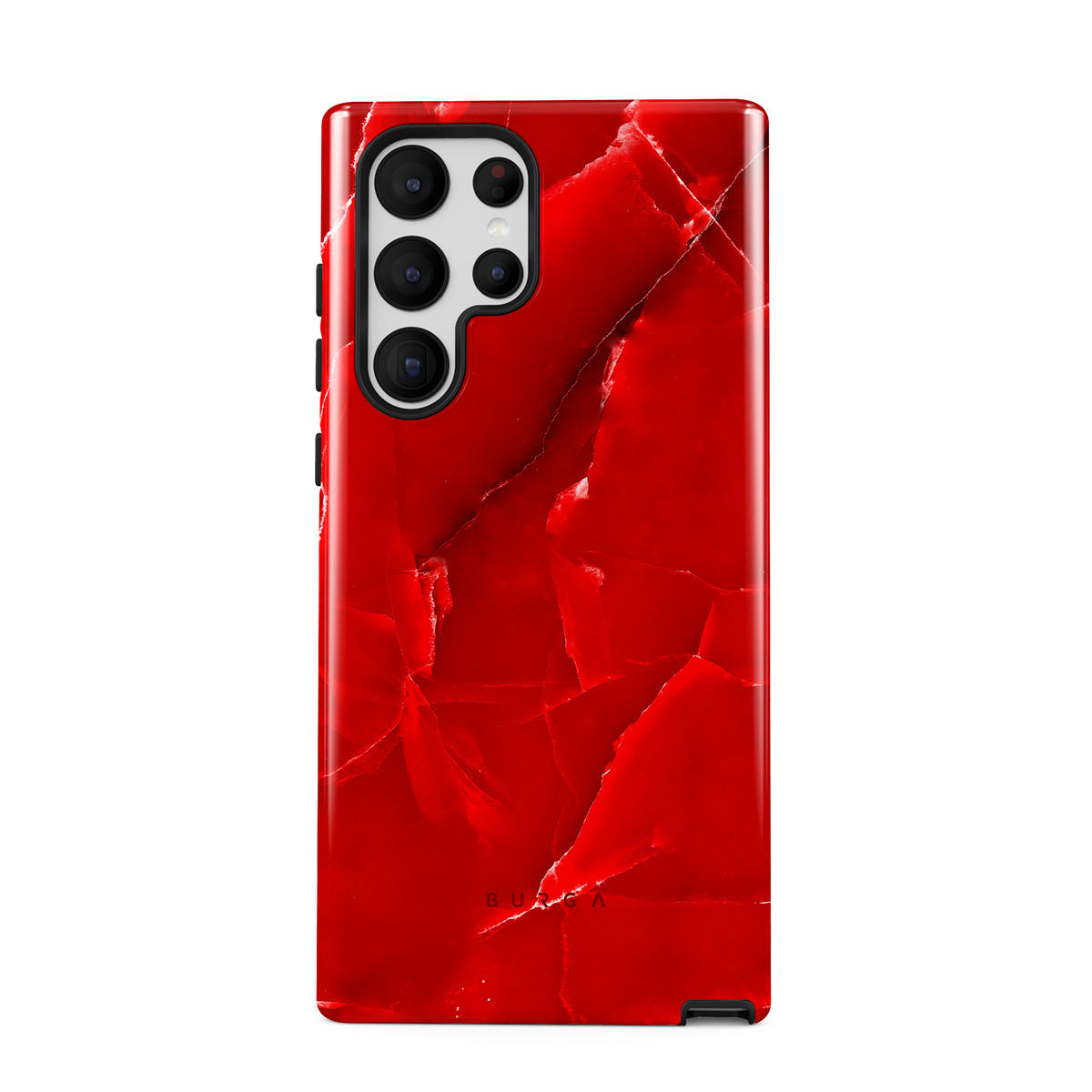 Be as bright as the red fire that cannot be tamed. The Wild Blaze Samsung Galaxy S22 Ultra phone case features a striking bright red marble design that is guaranteed to add fierceness and a pop of color to your beloved device.