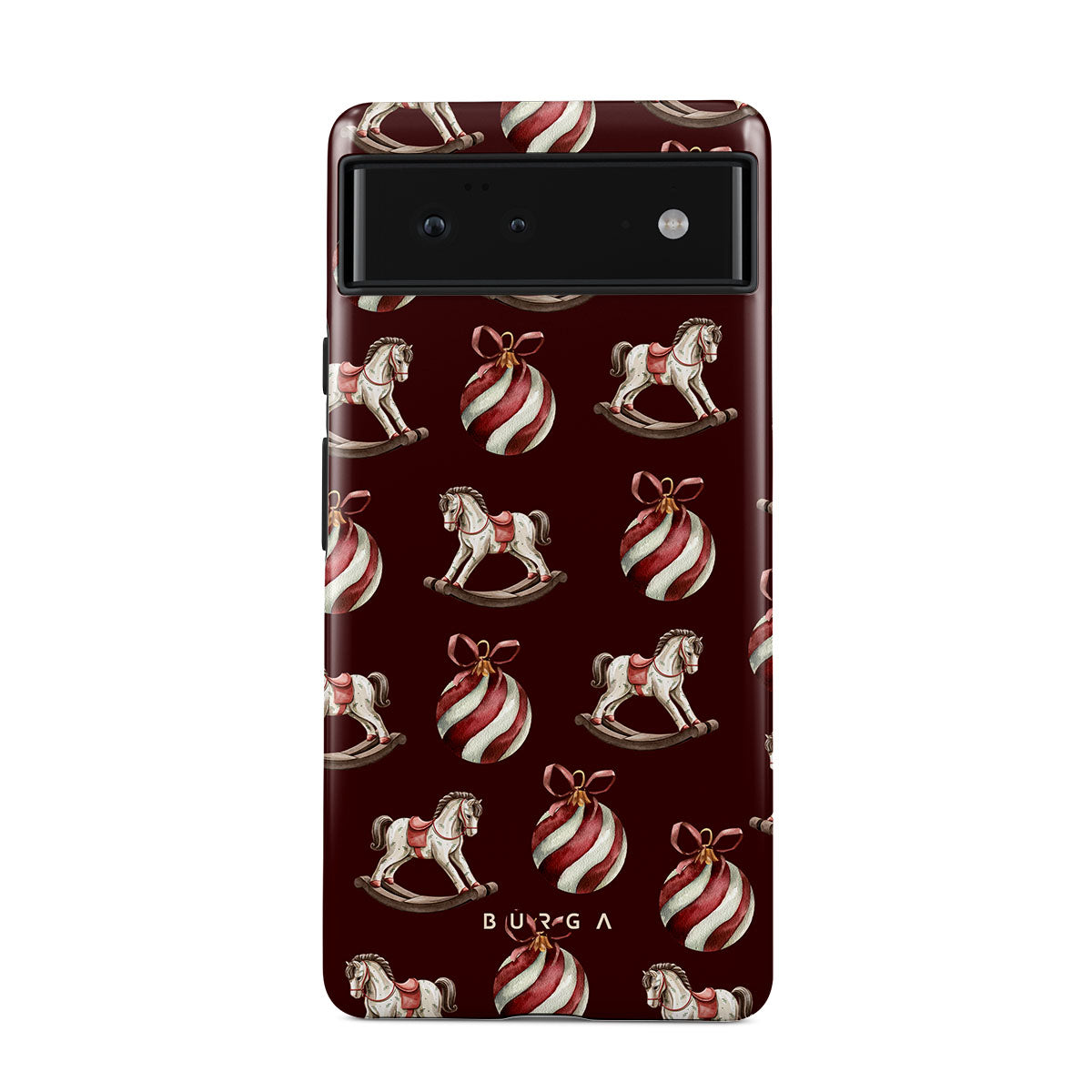 Jingle all the way with this playful Google Pixel 6a phone case design. Featuring rocking horses and candy-striped bells, our Rocking Around design transports you back to childhood moments of decorating the tree and waiting for Santa. It’s the ultimate throwback to vintage Christmas charm.