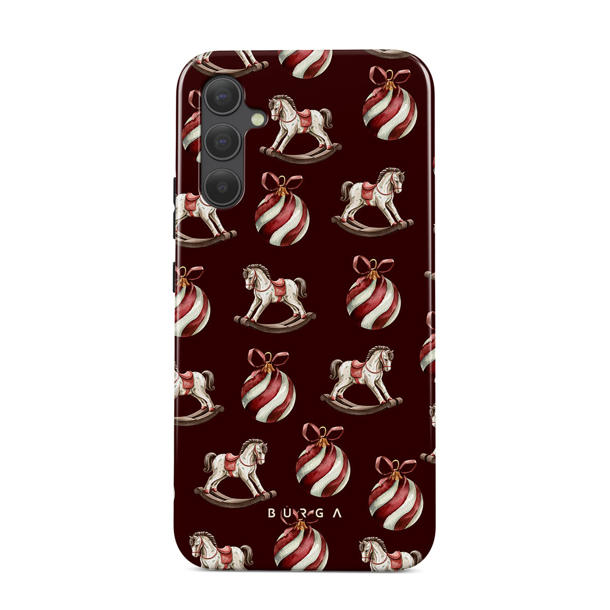 Jingle all the way with this playful Samsung Galaxy A34 phone case design. Featuring rocking horses and candy-striped bells, our Rocking Around design transports you back to childhood moments of decorating the tree and waiting for Santa. It’s the ultimate throwback to vintage Christmas charm.