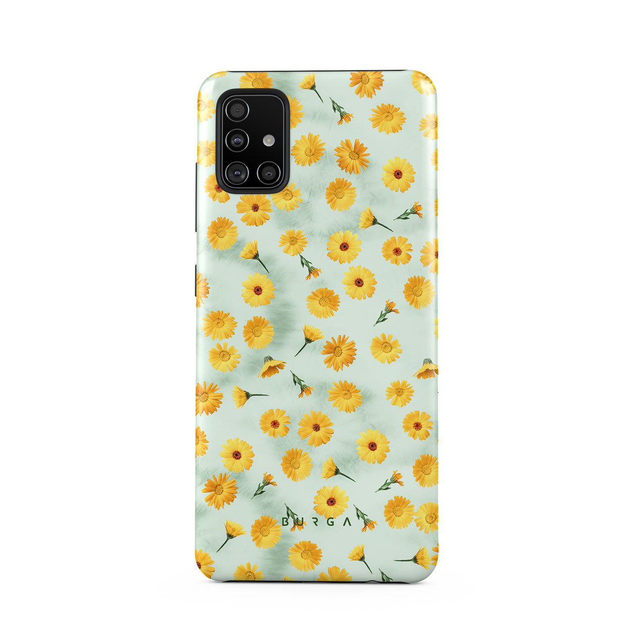 In our Sanctuary of Love Samsung Galaxy A71 phone case, a soft mint marble meets a glowing pattern of yellow flowers that will surely add a splash of energy to your style while protecting your phone from dangerous falls.