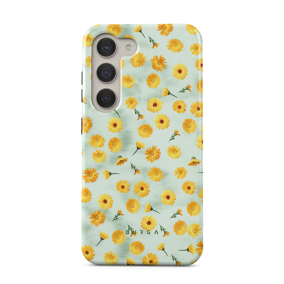 In our Sanctuary of Love Samsung Galaxy S23 phone case, a soft mint marble meets a glowing pattern of yellow flowers that will surely add a splash of energy to your style while protecting your phone from dangerous falls.