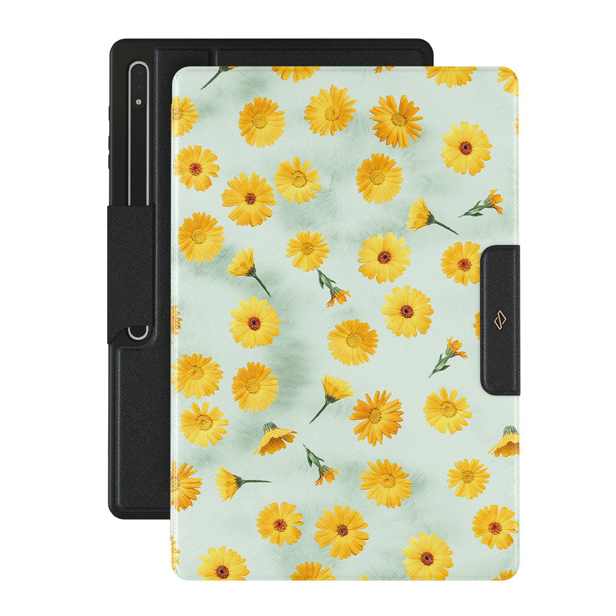 In our Sanctuary of Love Samsung Galaxy Tab S8 Ultra folio case, a soft mint marble meets a glowing pattern of yellow flowers that will surely add a splash of energy to your style while protecting your Galaxy Tab from dangerous falls.