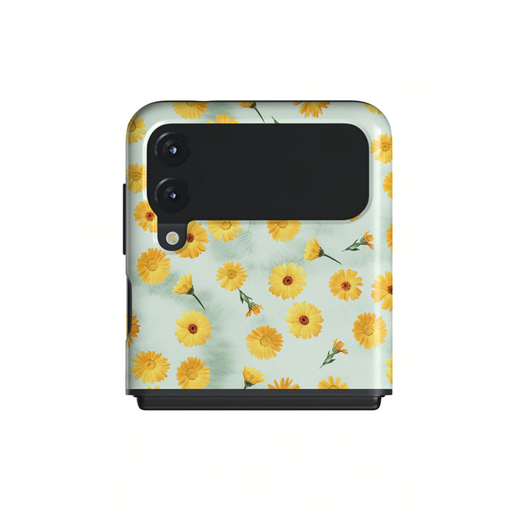 In our Sanctuary of Love Samsung Galaxy Z Flip 3 phone case, a soft mint marble meets a glowing pattern of yellow flowers that will surely add a splash of energy to your style while protecting your phone from dangerous falls.