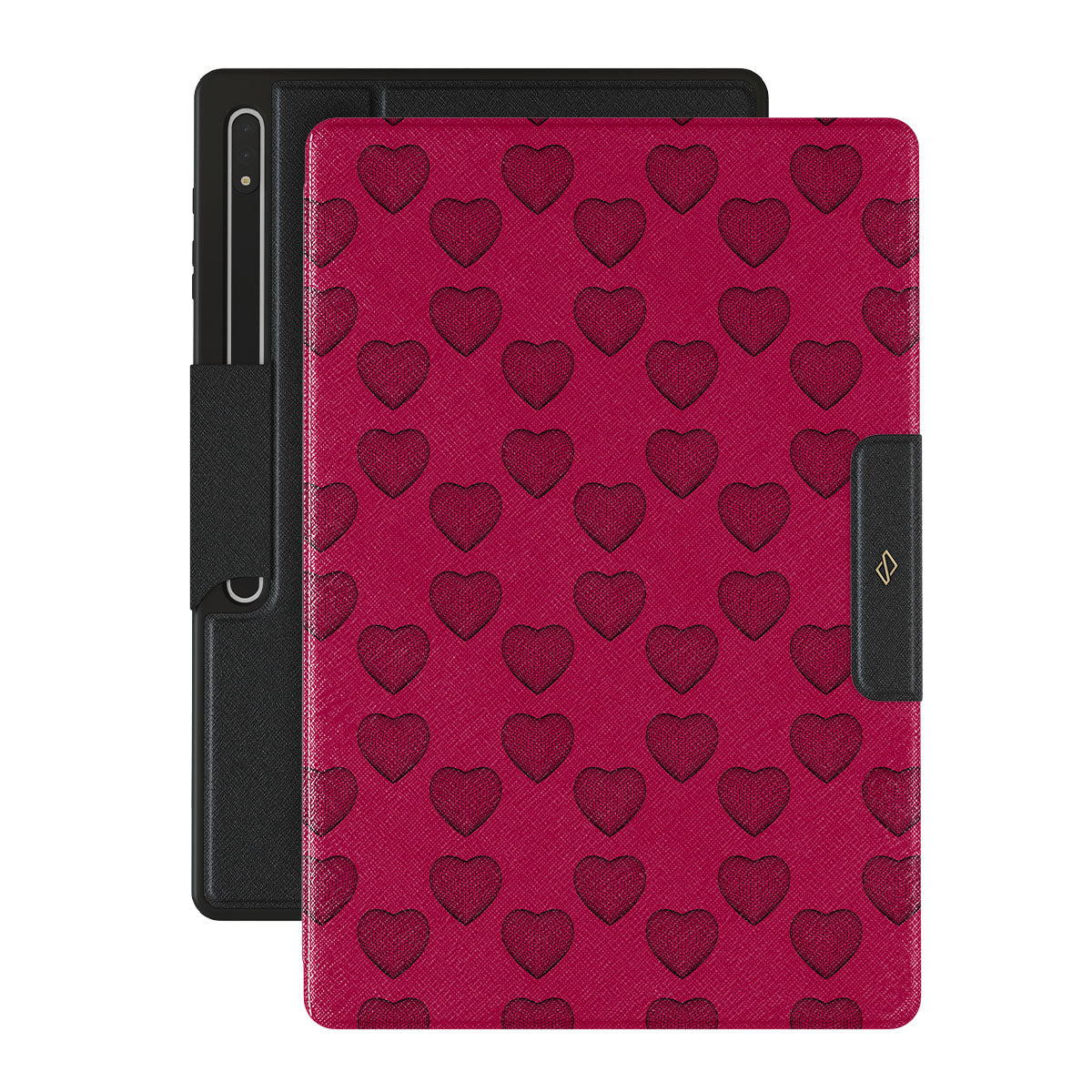 Forget roses. Show the world that you're confident, unapologetically yourself, and ready to take on the day. The vivid pink background is eye-catching and fun. The floating darker hearts add depth and sophistication. While serving as a gentle reminder to prioritize your own happiness, our Single Not Sorry Samsung Galaxy Tab S8 Ultra folio case will brighten up any outfit.