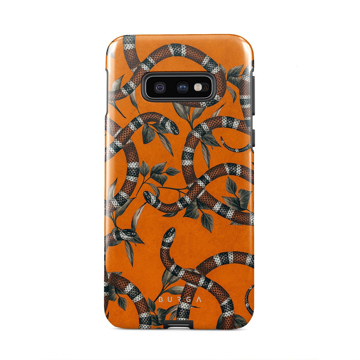 Take a bit of fierceness with yourself with our bright orange and dangerously beautiful Samsung Galaxy S10E phone case with a snake pattern. This case is real eye candy for fashion lovers and just as needed for those who strive to keep their phones protected.