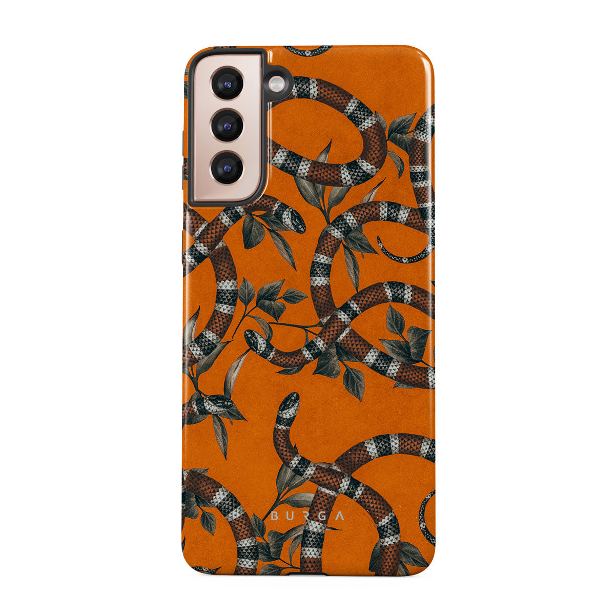 Take a bit of fierceness with yourself with our bright orange and dangerously beautiful Samsung Galaxy S21 Plus phone case with a snake pattern. This case is real eye candy for fashion lovers and just as needed for those who strive to keep their phones protected.