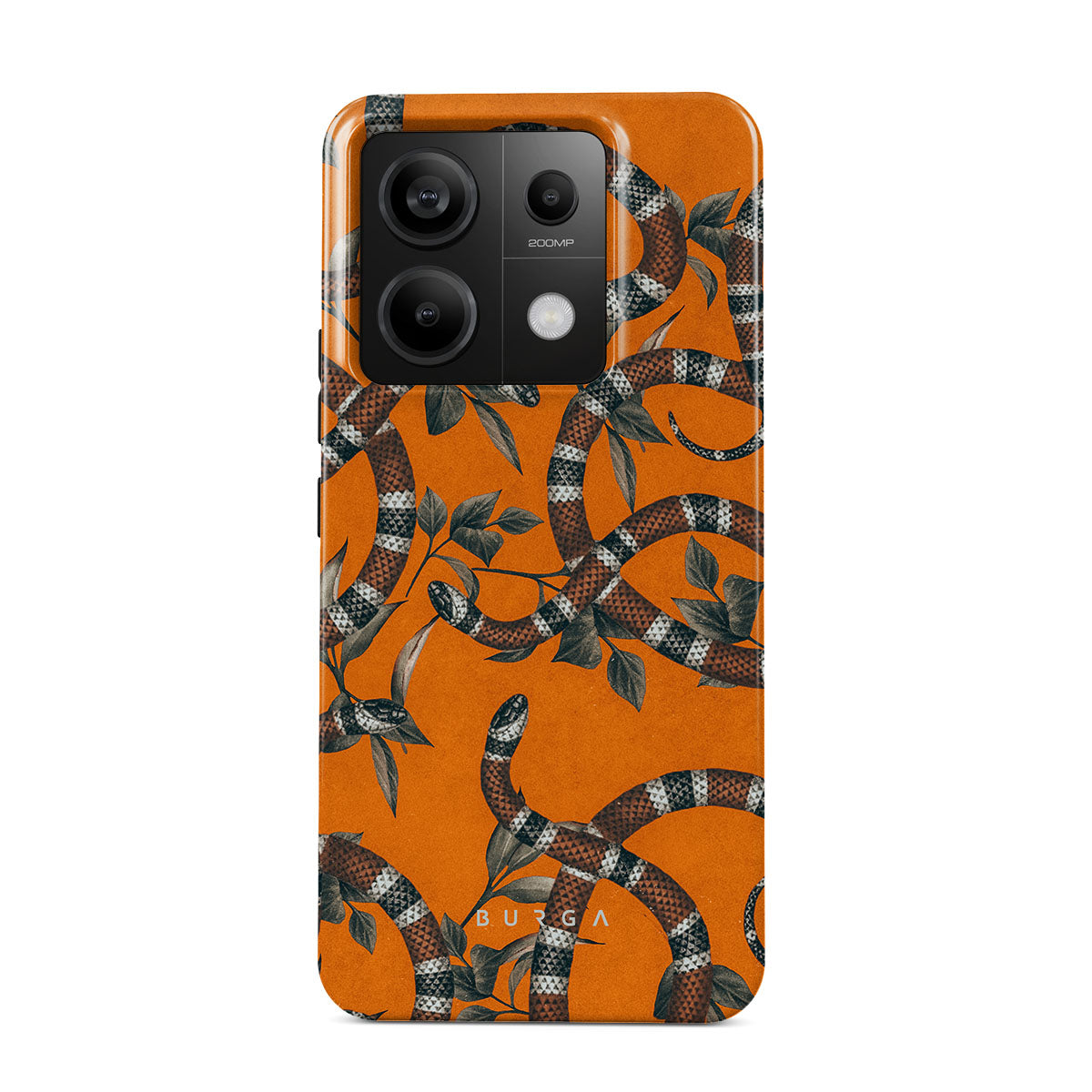 Take a bit of fierceness with yourself with our bright orange and dangerously beautiful Xiaomi Redmi Note 13 Pro 5G phone case with a snake pattern. This case is real eye candy for fashion lovers and just as needed for those who strive to keep their phones protected.