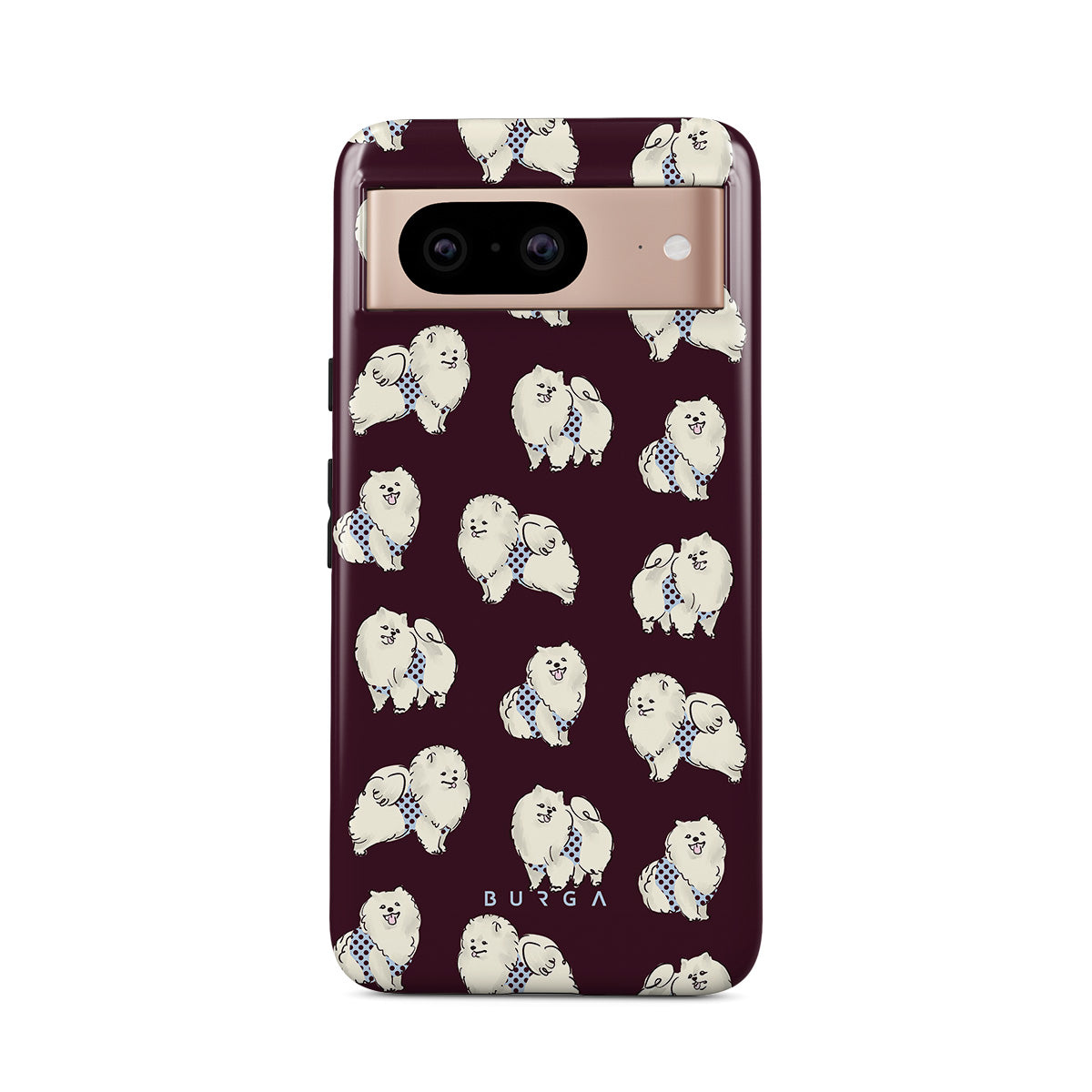 This design features: white fluffy dogs on a deep burgundy background, poodles, pets.