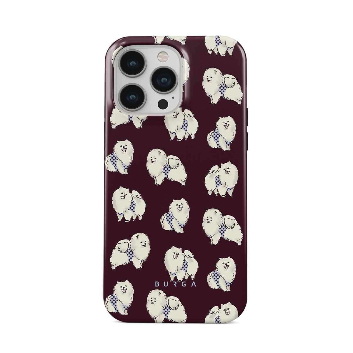 This design features: white fluffy dogs on a deep burgundy background, poodles, pets.