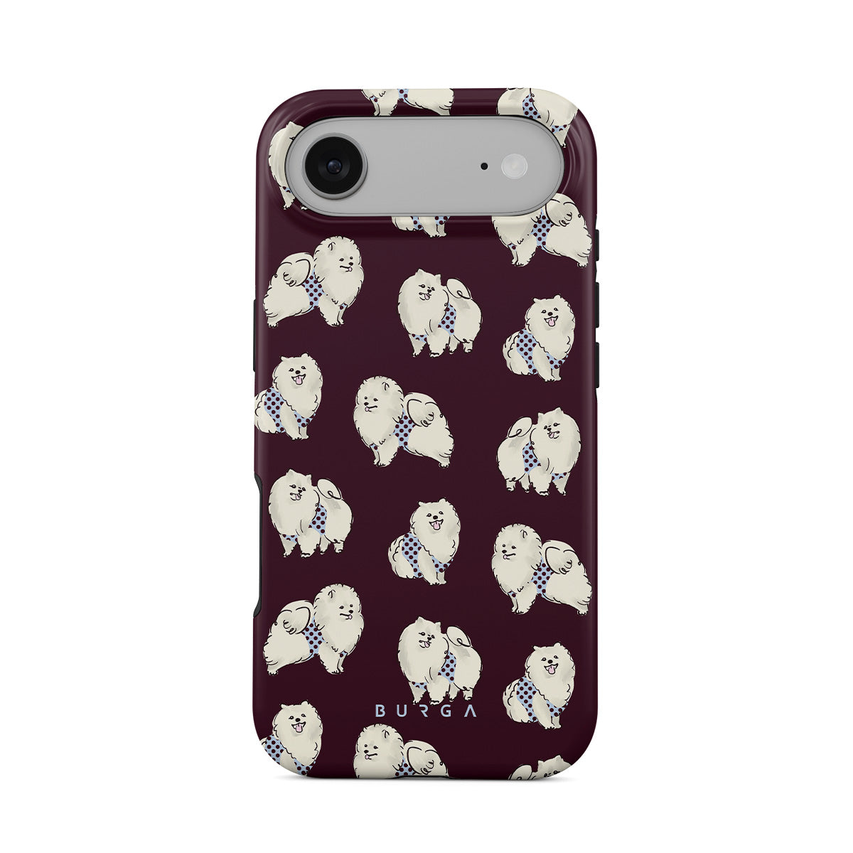 This design features: white fluffy dogs on a deep burgundy background, poodles, pets.
