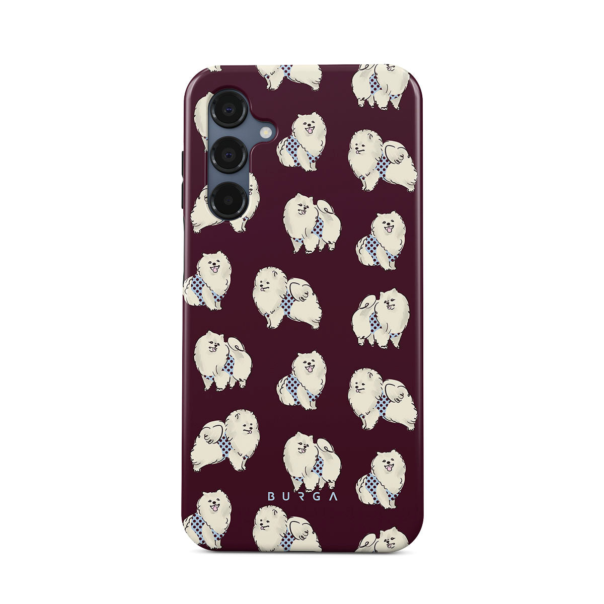 This design features: white fluffy dogs on a deep burgundy background, poodles, pets.