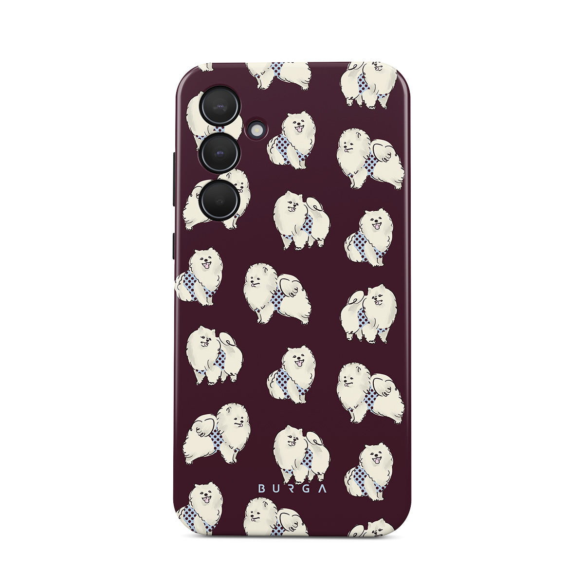 This design features: white fluffy dogs on a deep burgundy background, poodles, pets.