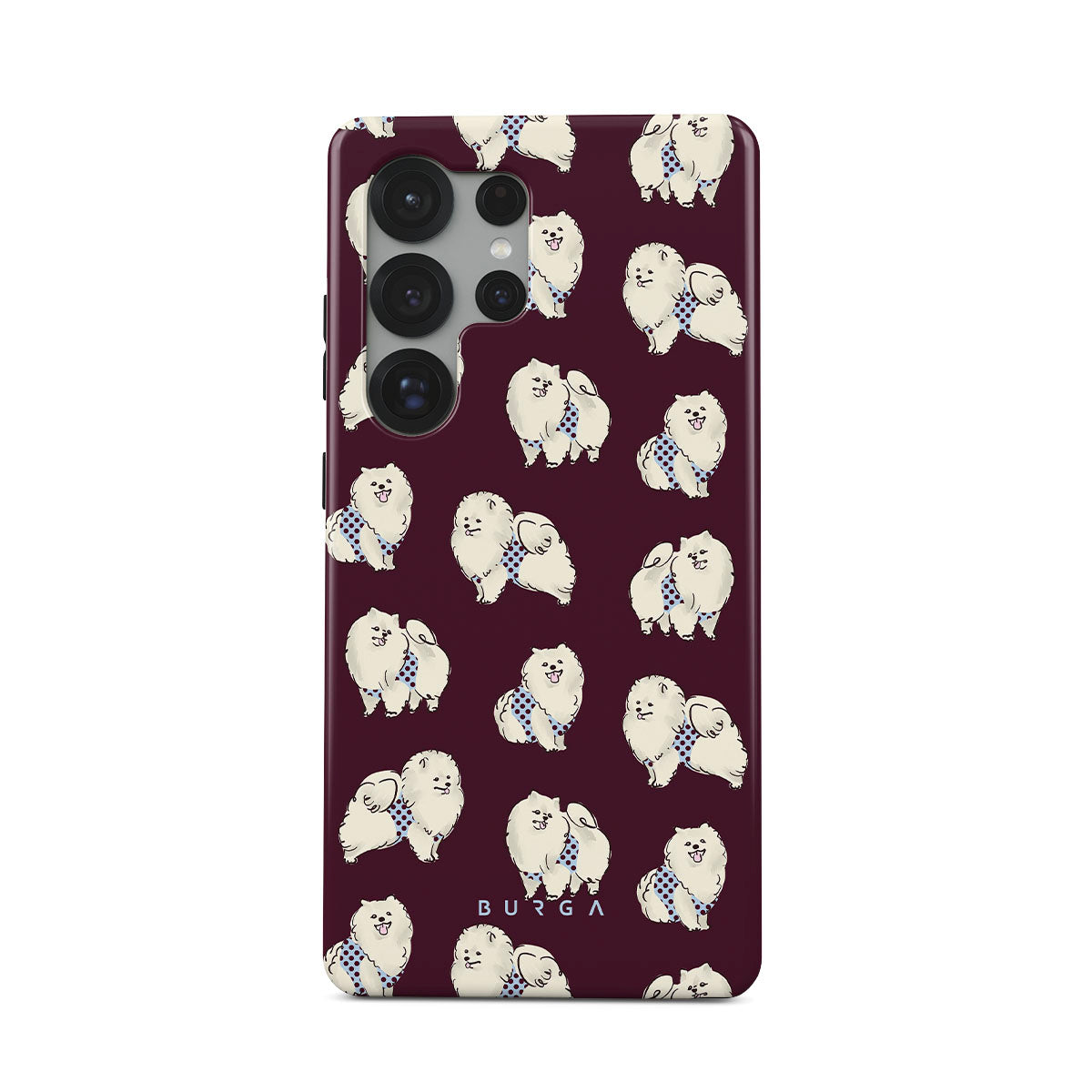 This design features: white fluffy dogs on a deep burgundy background, poodles, pets.