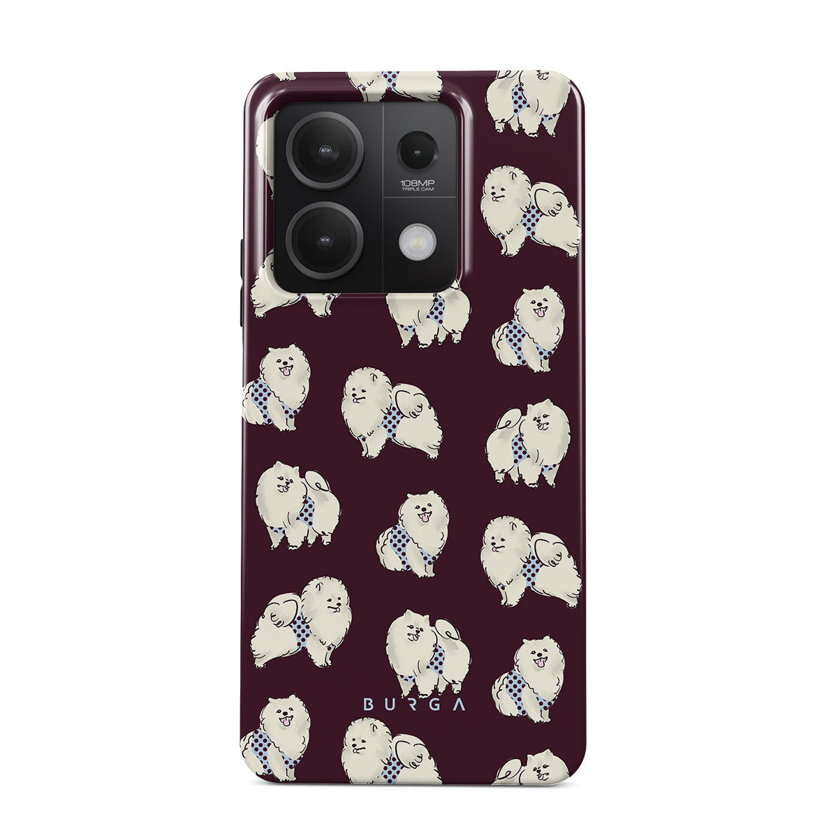 This design features: white fluffy dogs on a deep burgundy background, poodles, pets.