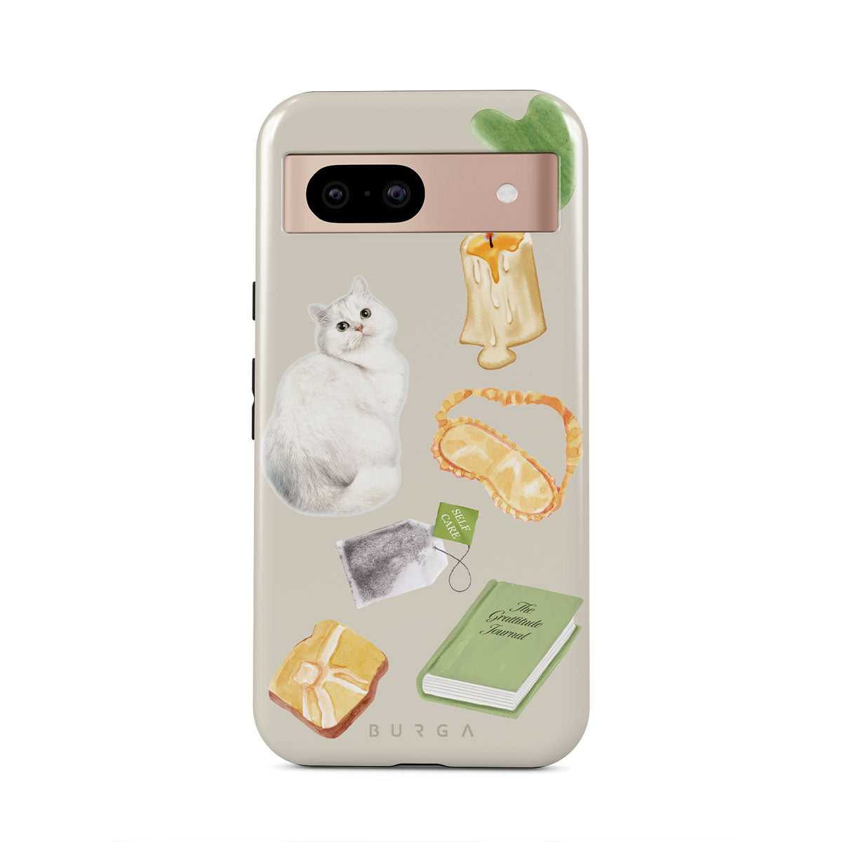 This design features: white cat, green book, candle, Gua Sha bar, sleeping mask, tea bag, yellow crystal