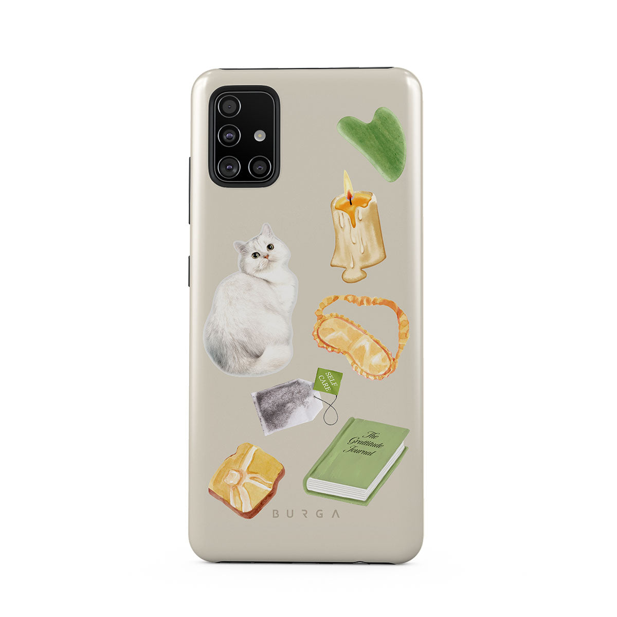 This design features: white cat, green book, candle, Gua Sha bar, sleeping mask, tea bag, yellow crystal