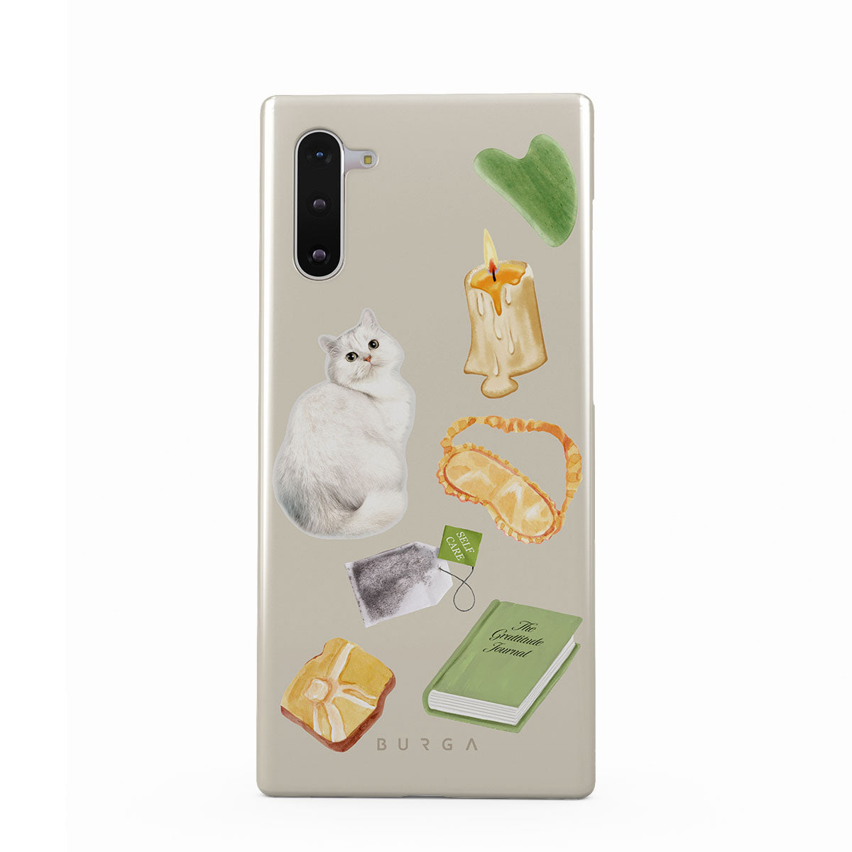 This design features: white cat, green book, candle, Gua Sha bar, sleeping mask, tea bag, yellow crystal
