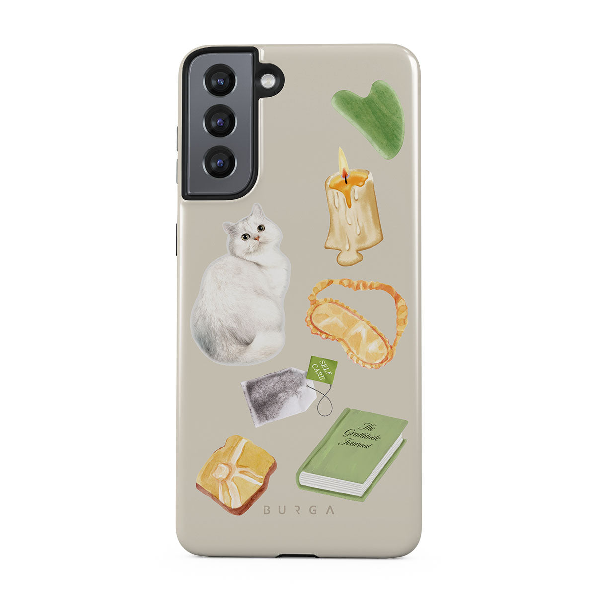This design features: white cat, green book, candle, Gua Sha bar, sleeping mask, tea bag, yellow crystal