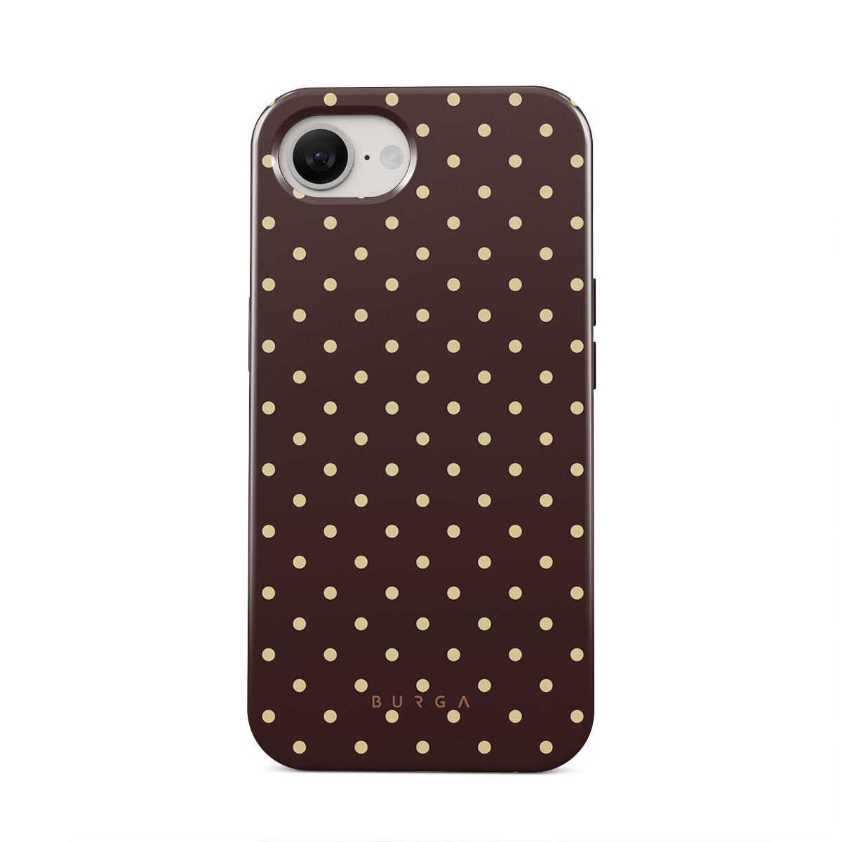 Playful yet polished, our Sorry Busy iPhone 16e phone case design features a warm brown background sprinkled with delicate beige polka dots, blending charm with a professional edge. It's for those who keep it stylish, even when fully booked and thriving.