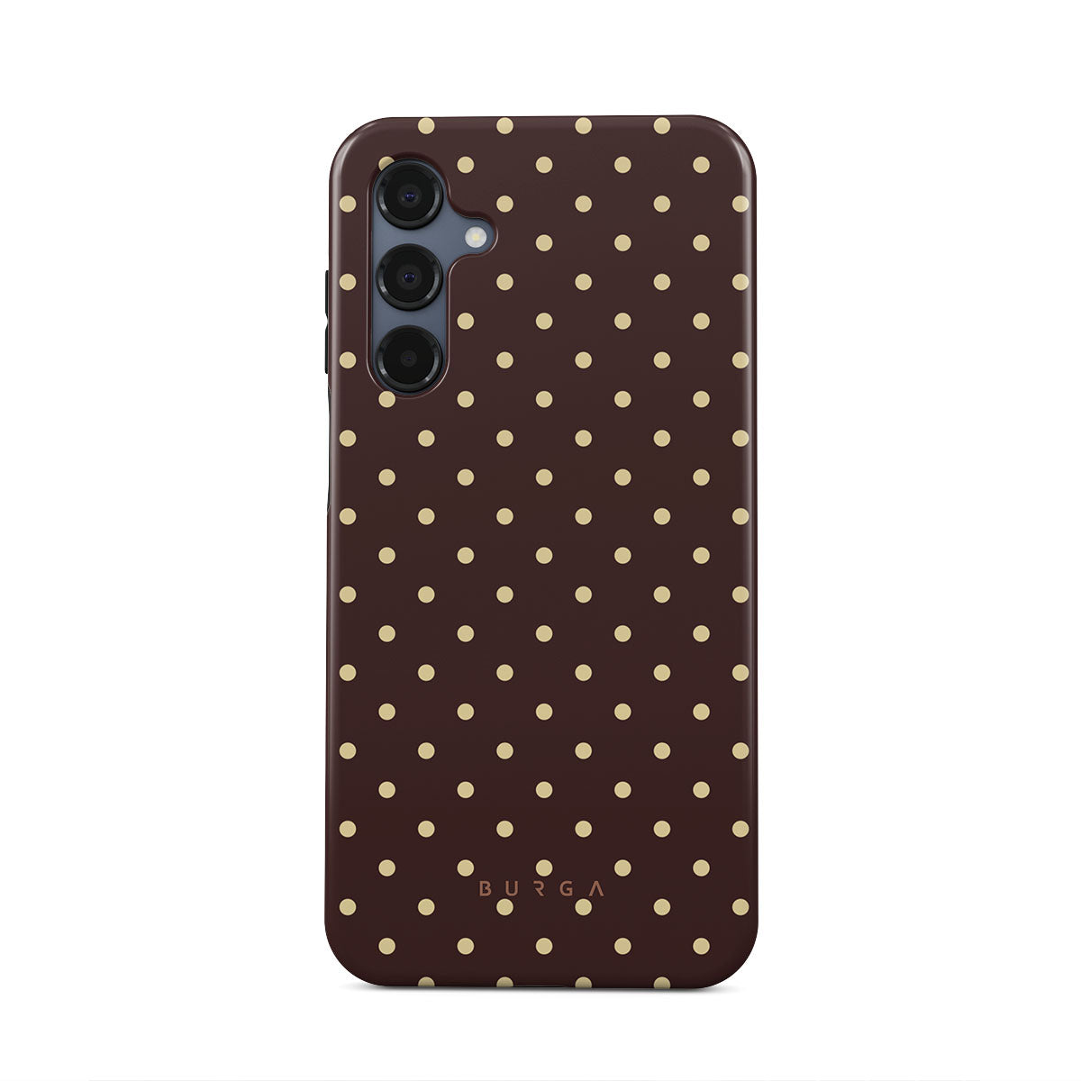 Playful yet polished, our Sorry Busy Samsung Galaxy A16 phone case design features a warm brown background sprinkled with delicate beige polka dots, blending charm with a professional edge. It's for those who keep it stylish, even when fully booked and thriving.