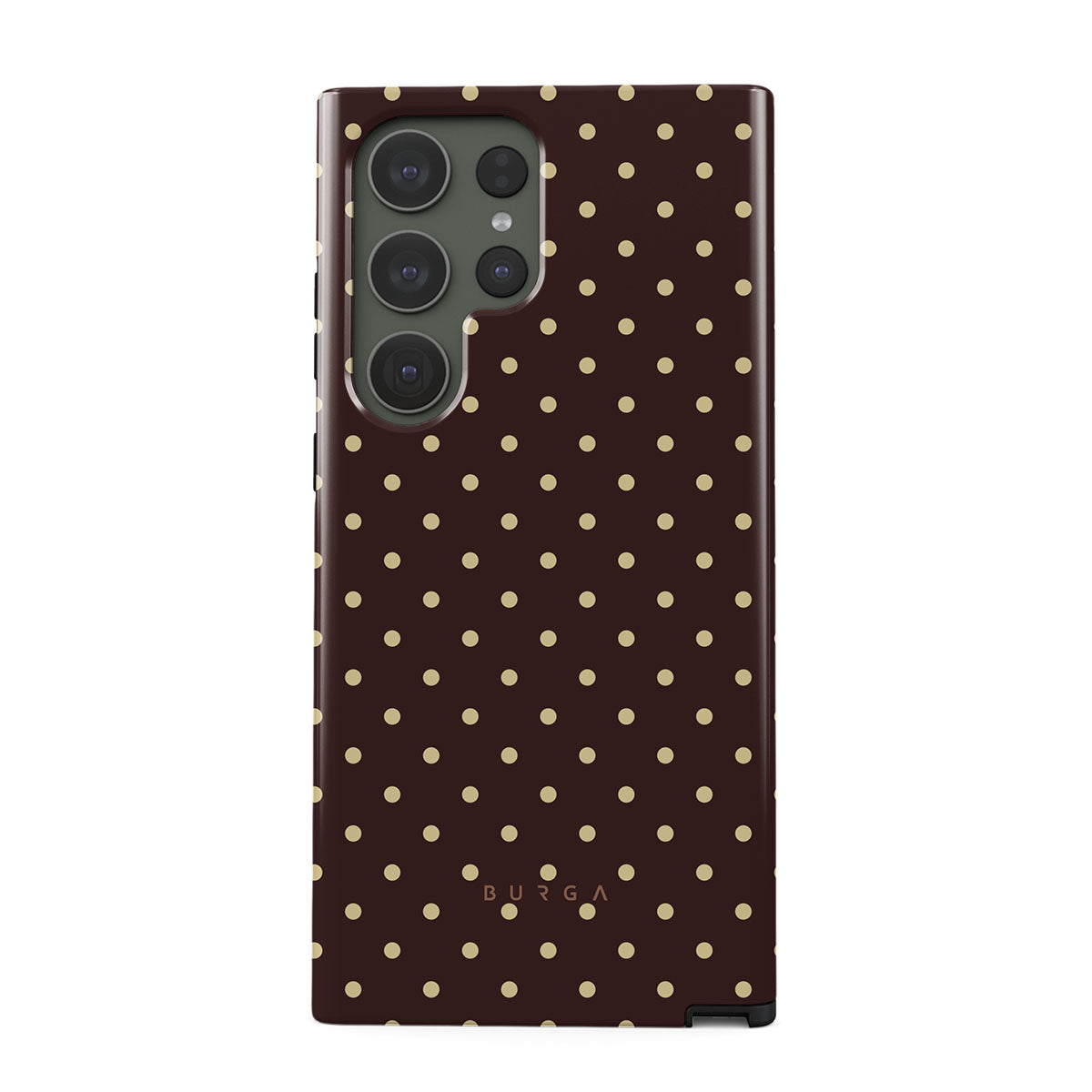 Playful yet polished, our Sorry Busy Samsung Galaxy S23 Ultra phone case design features a warm brown background sprinkled with delicate beige polka dots, blending charm with a professional edge. It's for those who keep it stylish, even when fully booked and thriving.
