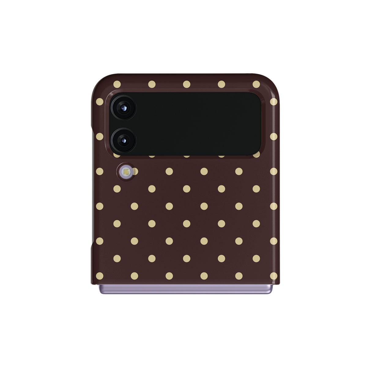 Playful yet polished, our Sorry Busy Samsung Galaxy Z Flip 4 phone case design features a warm brown background sprinkled with delicate beige polka dots, blending charm with a professional edge. It's for those who keep it stylish, even when fully booked and thriving.