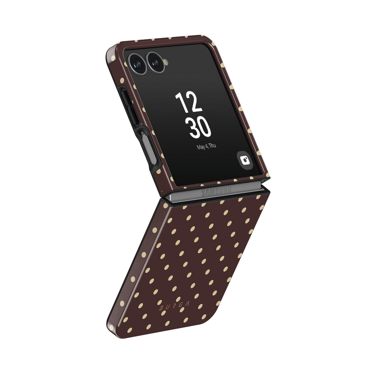 Playful yet polished, our Sorry Busy Samsung Galaxy Z Flip 7 phone case design features a warm brown background sprinkled with delicate beige polka dots, blending charm with a professional edge. It's for those who keep it stylish, even when fully booked and thriving.