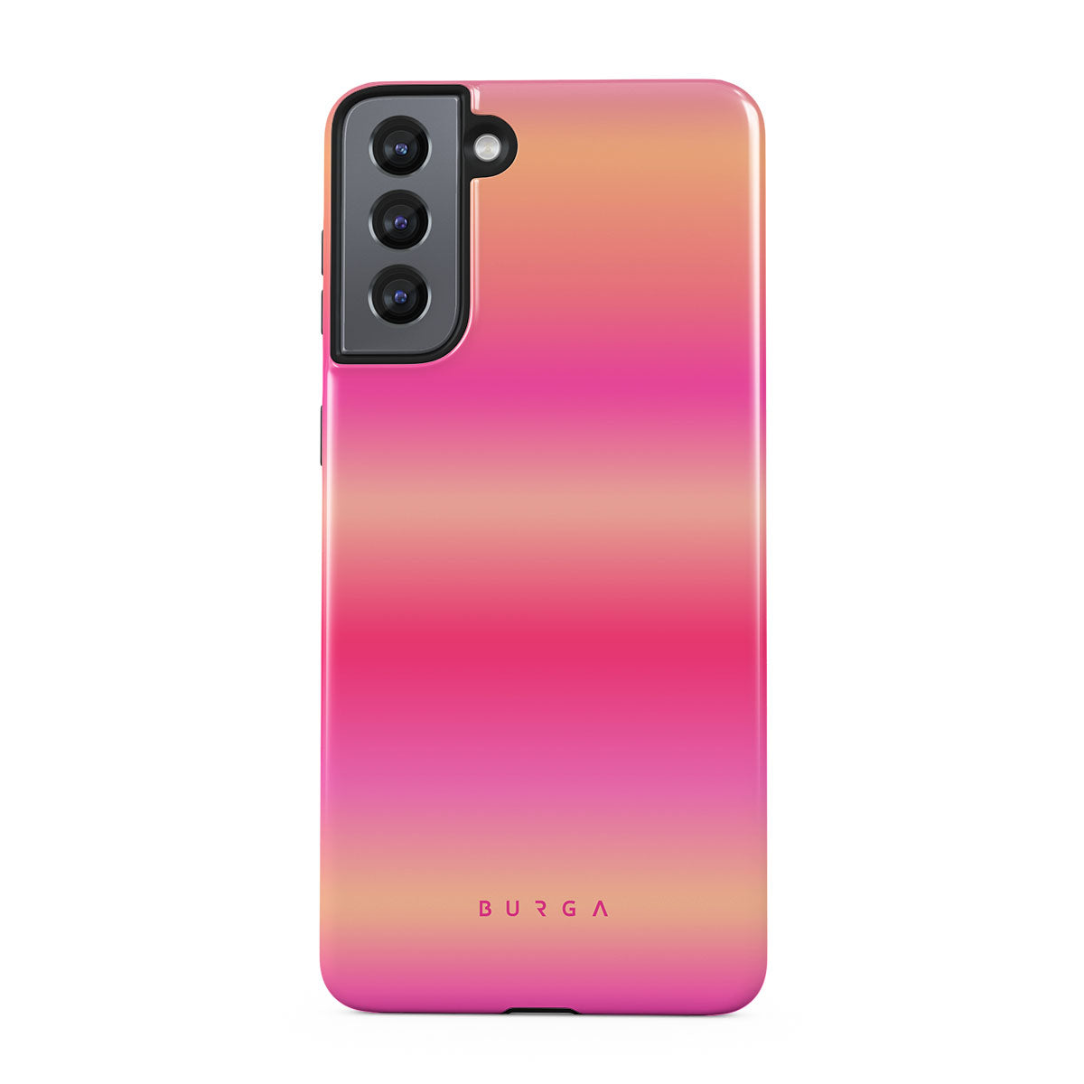 Introducing SPF100—a Samsung Galaxy S21 phone case that's as hot as a summer's day. Featuring a gradient of vivid pinks and warm oranges, this design radiates bold, vibrant energy, reminiscent of sun-kissed skin and tropical getaways.