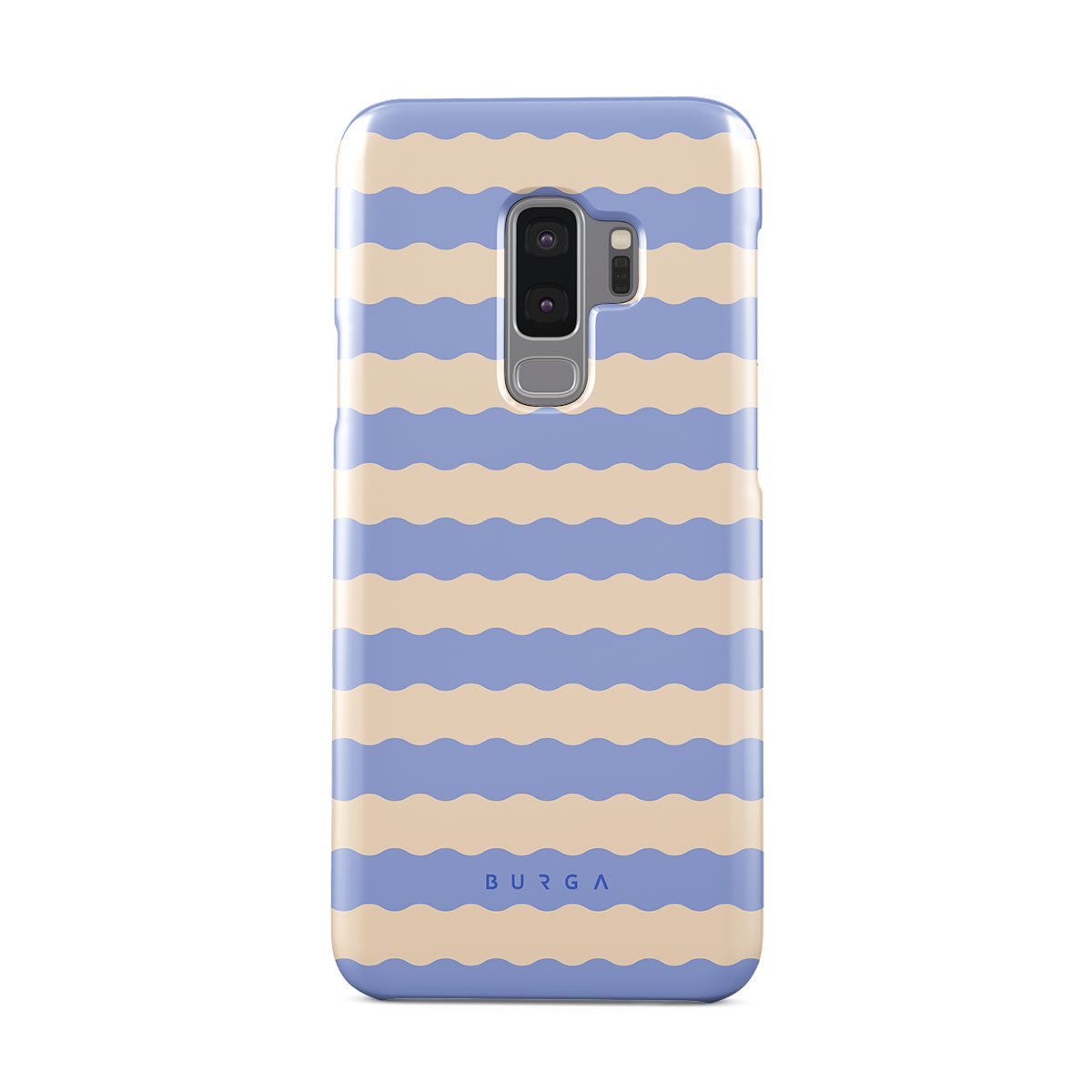 Dive into the cool, refreshing style of our Splash design–a dynamic Samsung Galaxy S9 Plus phone case featuring playful, wavy stripes of serene ocean blue and soft sandy beige. Perfect for those who love to make a splash with their accessories.