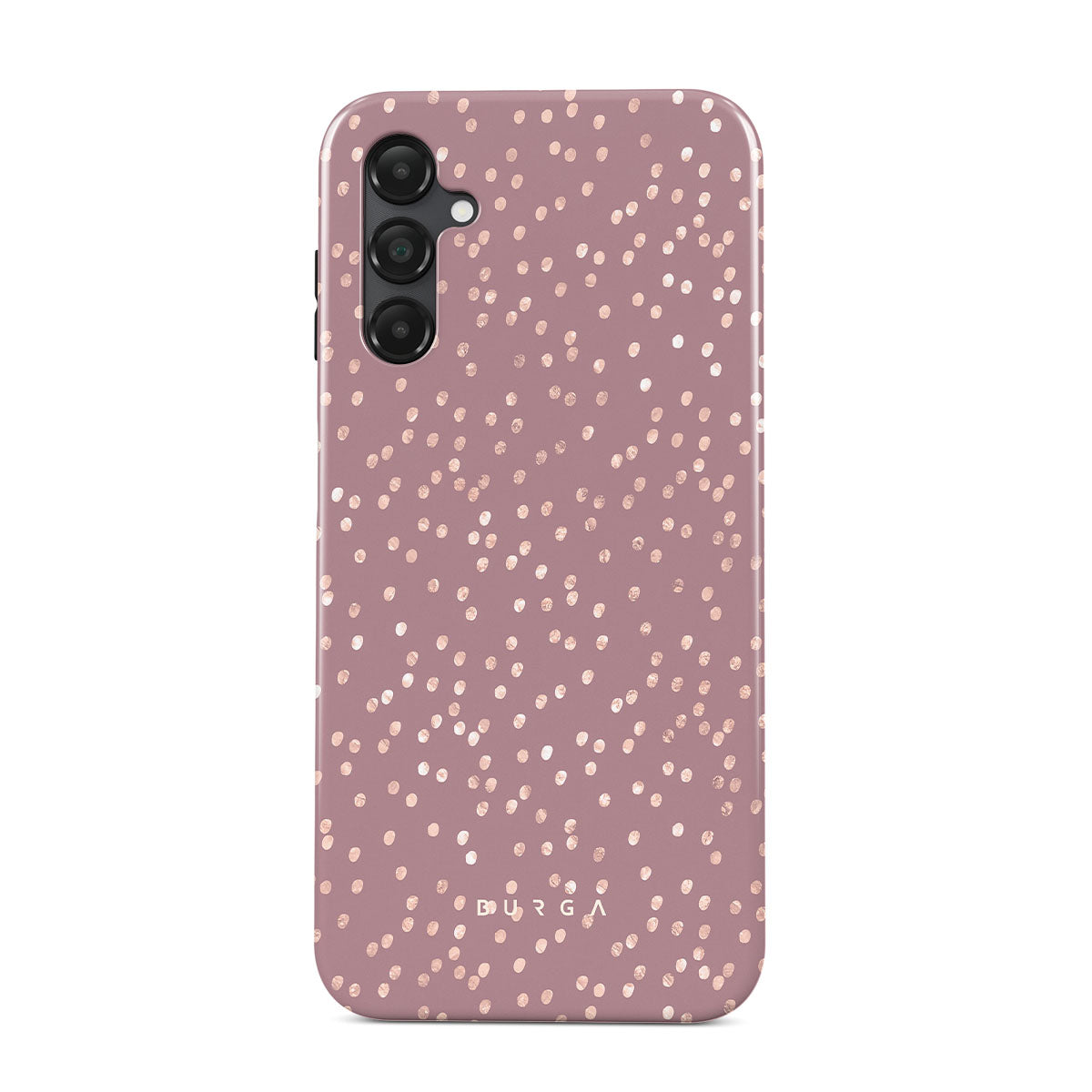 Trendy mauve color as a background for the gold-colored spots creates true beauty. Make your Samsung Galaxy A25 stand out with our protective and pretty Hot Cocoa phone case. The spotted pattern adds a touch of luxury to your phone, while the case's hard-shell nature offers much-needed protection.