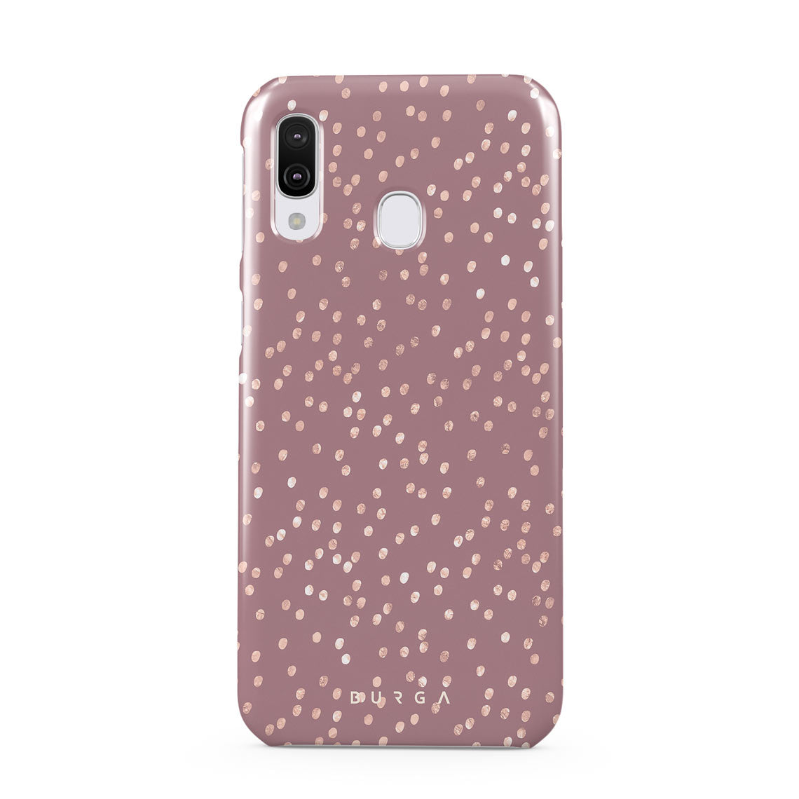 Trendy mauve color as a background for the gold-colored spots creates true beauty. Make your Samsung Galaxy A40 stand out with our protective and pretty Hot Cocoa phone case. The spotted pattern adds a touch of luxury to your phone, while the case's hard-shell nature offers much-needed protection.
