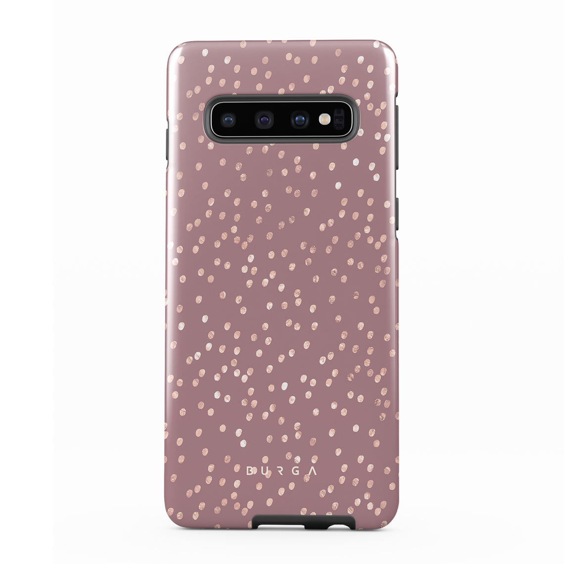 Trendy mauve color as a background for the gold-colored spots creates true beauty. Make your Samsung Galaxy S10 stand out with our protective and pretty Hot Cocoa phone case. The spotted pattern adds a touch of luxury to your phone, while the case's hard-shell nature offers much-needed protection.