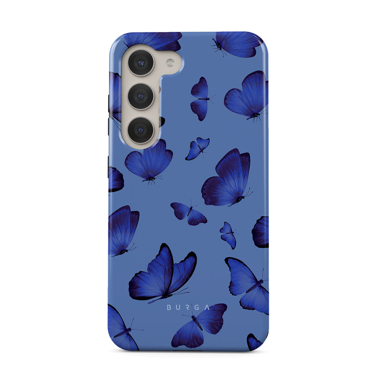 Bright blue butterflies dance across a sky-blue expanse, a visual representation of freedom and transformation. Our Spring Court Samsung Galaxy S23 Plus phone case design symbolizes the soul's eternal dance with change, each flutter a step towards becoming who we are meant to be.