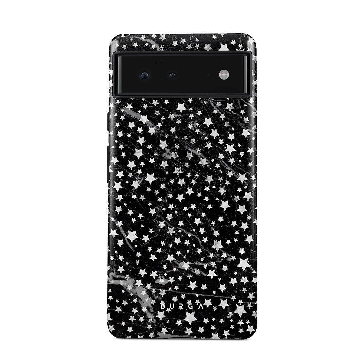 Google Pixel 6a phone case is inspired by the sky above us. Here the charming star pattern meets with a trendy black and white marble. Add the unique combination to your wardrobe and transform your protective phone case into a fashion accessory.