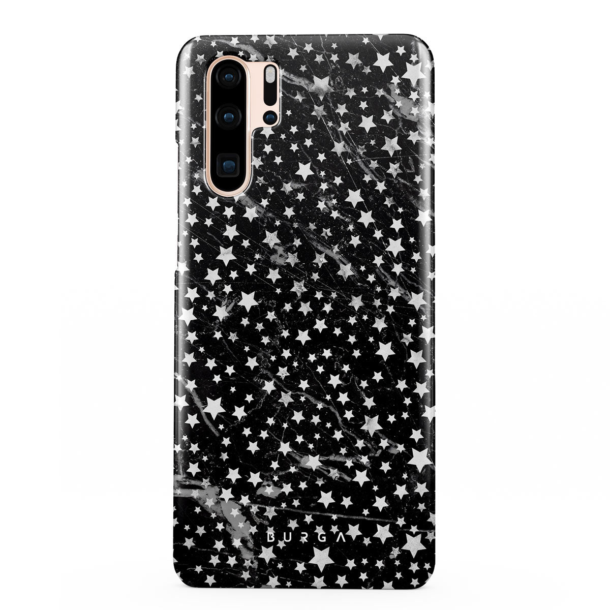 Huawei P30 Pro phone case is inspired by the sky above us. Here the charming star pattern meets with a trendy black and white marble. Add the unique combination to your wardrobe and transform your protective phone case into a fashion accessory.