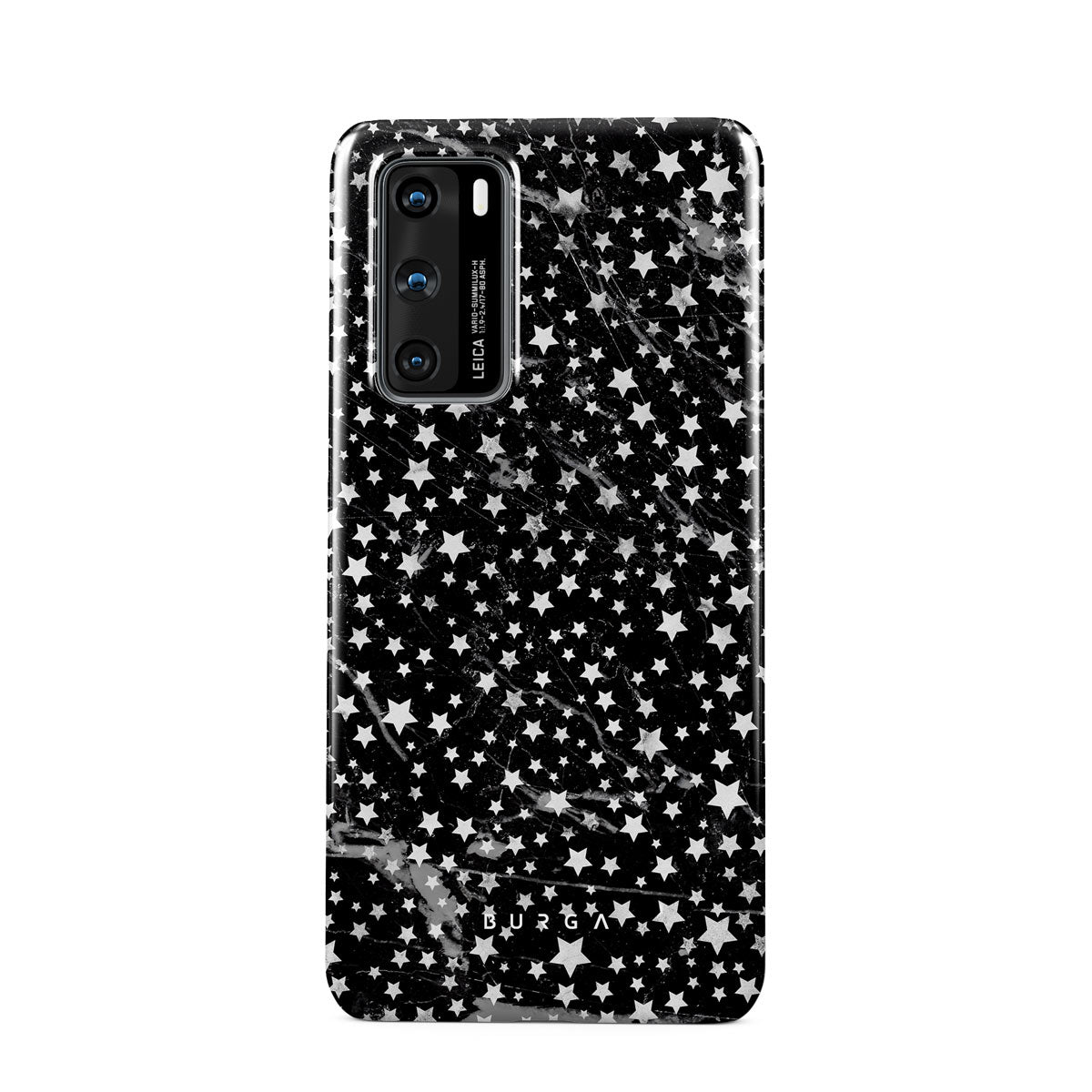 Huawei P40 phone case is inspired by the sky above us. Here the charming star pattern meets with a trendy black and white marble. Add the unique combination to your wardrobe and transform your protective phone case into a fashion accessory.