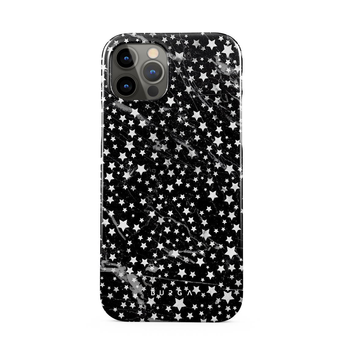 iPhone 12 Pro Max phone case is inspired by the sky above us. Here the charming star pattern meets with a trendy black and white marble. Add the unique combination to your wardrobe and transform your protective phone case into a fashion accessory.