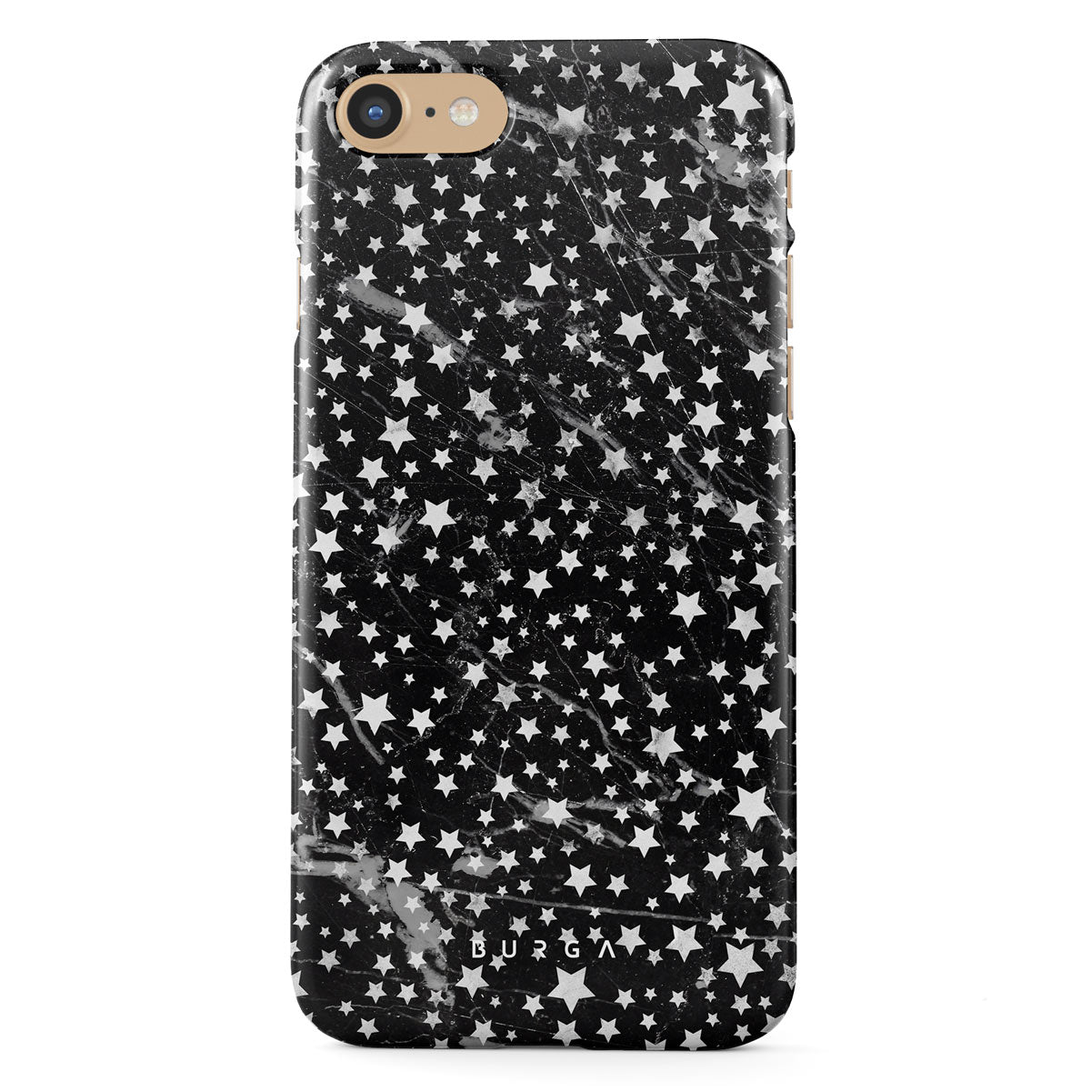 iPhone SE (2020) phone case is inspired by the sky above us. Here the charming star pattern meets with a trendy black and white marble. Add the unique combination to your wardrobe and transform your protective phone case into a fashion accessory.