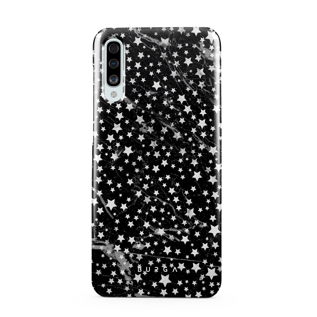 Samsung Galaxy A50 phone case is inspired by the sky above us. Here the charming star pattern meets with a trendy black and white marble. Add the unique combination to your wardrobe and transform your protective phone case into a fashion accessory.