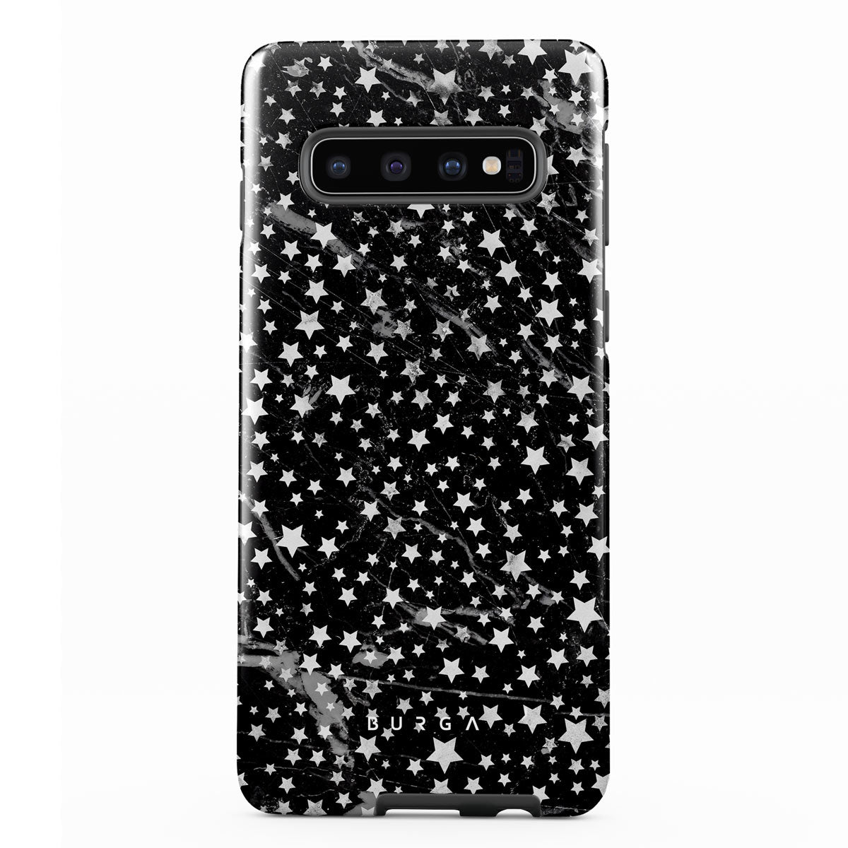 Samsung Galaxy S10 phone case is inspired by the sky above us. Here the charming star pattern meets with a trendy black and white marble. Add the unique combination to your wardrobe and transform your protective phone case into a fashion accessory.