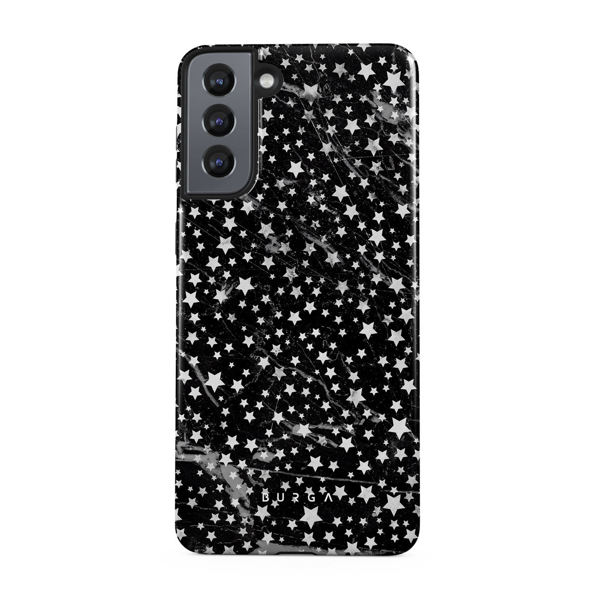 Samsung Galaxy S21 phone case is inspired by the sky above us. Here the charming star pattern meets with a trendy black and white marble. Add the unique combination to your wardrobe and transform your protective phone case into a fashion accessory.