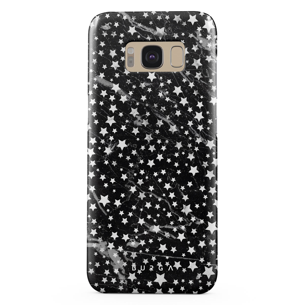Samsung Galaxy S8 phone case is inspired by the sky above us. Here the charming star pattern meets with a trendy black and white marble. Add the unique combination to your wardrobe and transform your protective phone case into a fashion accessory.