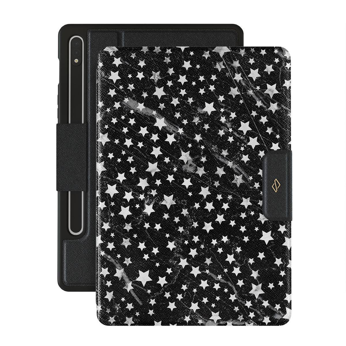 Dark, endless with flickering stars, the Starry Night Samsung Galaxy Tab S8/S7 folio case is inspired by the sky above us. Here the charming star pattern meets with a trendy black and white marble. Add the unique combination to your wardrobe and transform your protective Galaxy Tab case cover into a fashion accessory.