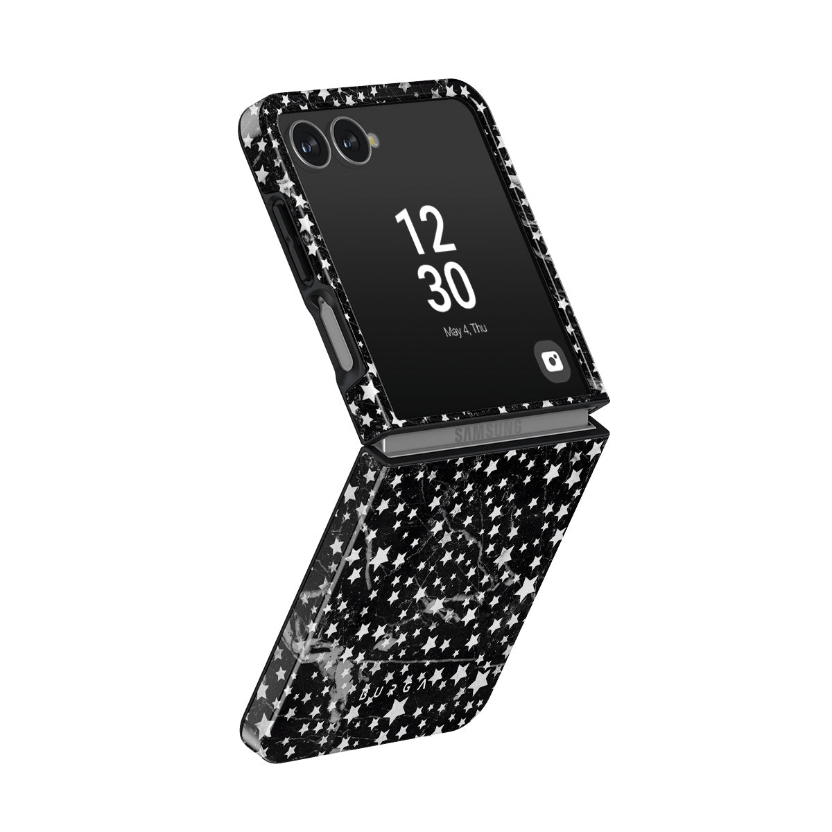 Samsung Galaxy Z Flip 7 phone case is inspired by the sky above us. Here the charming star pattern meets with a trendy black and white marble. Add the unique combination to your wardrobe and transform your protective phone case into a fashion accessory.